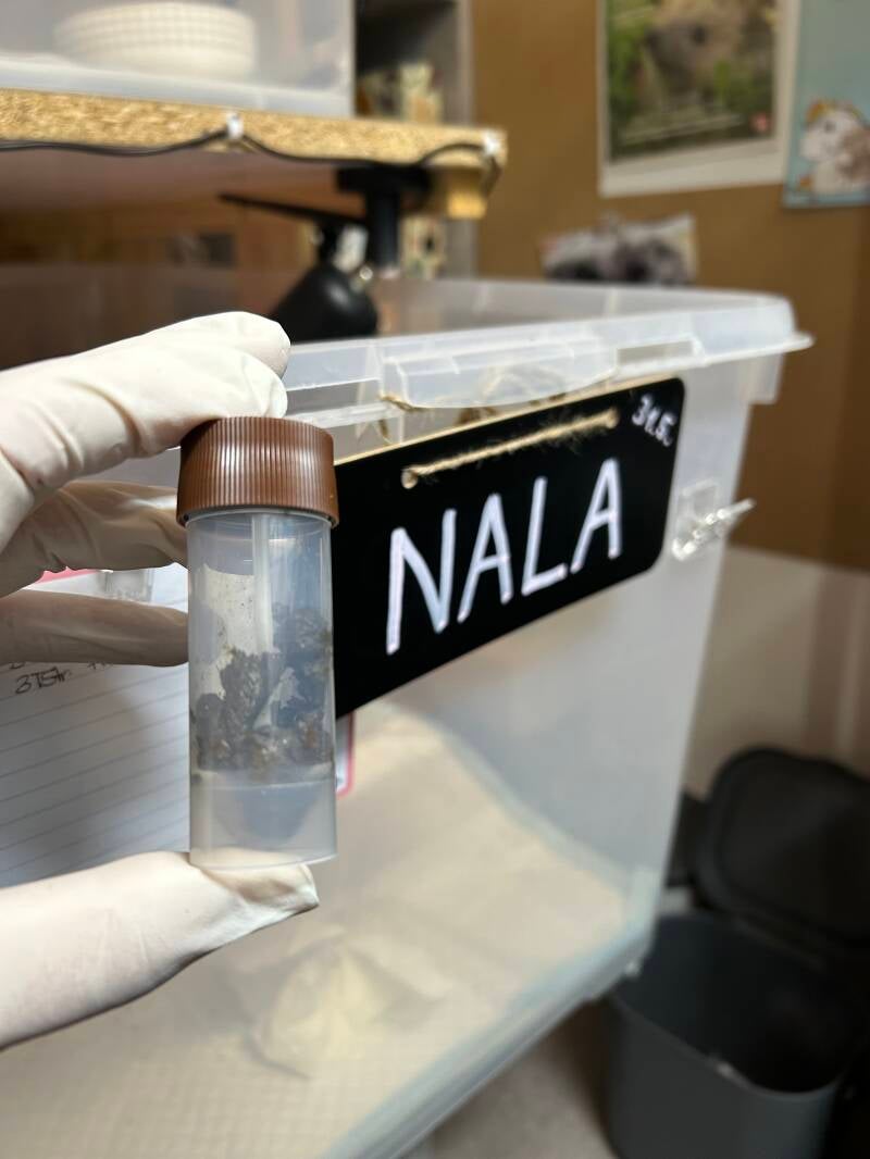 Asha wiegt heute 893g. Ihr Kot wandert gleich nochmal unters Mikroskop und sollte er in Ordnung sein, darf sie von der Box ins Gehege ziehen.
